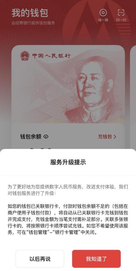 8 月 23 日,數字人民幣(試點版)App 上新“隨用隨充”功能,即銀行卡賬戶資金與數字人民幣錢包之間的自動充錢功能。