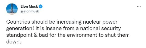 “各國應該增加核能發電!從國家安全的角度來看,關閉核電是瘋狂的,而且對環境不利。”馬斯克在推文中寫道。