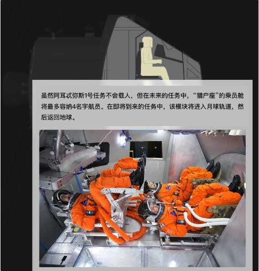 為了更好地了解人類在飛船里的生活狀況,NASA 在飛船里安裝了一個假人。NASA 稱,這個名為穆尼金?坎波斯 (Moonikin Campos) 的假人是以阿波羅 13 號時代的電氣工程師阿圖羅?坎波斯 (Arturo Campus) 的名字命名的,它將配備傳感器,以測量人類在飛行過程中會經歷的輻射以及“振動和加速”。