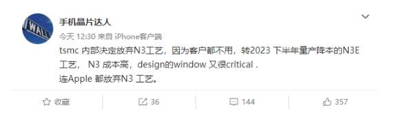 來自中國臺灣芯片產業鏈的數碼博主 @手機晶片達人 表示,臺積電內部已經決定放棄 N3 工藝,因為客戶幾乎都不愿意用,包括蘋果,發展方向將轉向 2023 下半年量產的 N3E 工藝。據稱,N3 成本高,N3E 更具性價比。