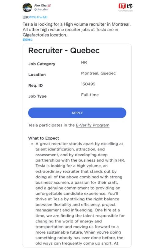 據(jù) TESLARATI 今日報道,推特用戶 Alex Oha 發(fā)現(xiàn),特斯拉正在加拿大蒙特利爾招聘 HR,該 HR 將負責大量招聘員工。與一般 HR 不同,特斯拉僅在已經(jīng)建立超級工廠的地方招聘此類 HR,例如美國得克薩斯州和德國柏林。因此,這暗示著特斯拉將在加拿大蒙特利爾新建超級工廠。