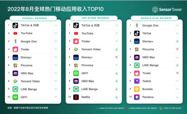 Sensor Tower 商店情報數據顯示,2022 年 8 月抖音及海外版 TikTok 在全球 App Store 和 Google Play 吸金超過 3.06 億美元,是去年同期的 1.8 倍,蟬聯全球移動應用 (非游戲) 收入榜冠軍。其中,大約 47.2% 的收入來自中國版本抖音;美國市場排名第二,貢獻了 16.5% 的收入;日本市場排名第三,占 4.2%。