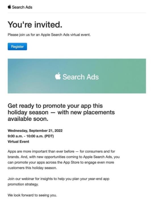對于消費者和品牌而言,應(yīng)用程序比以往任何時候都更加重要。而且,隨著蘋果搜索廣告的新機(jī)遇的到來,你可以在 App Store 中推廣你的應(yīng)用,在這個節(jié)日季吸引更多的用戶。加入我們的網(wǎng)絡(luò)研討會,幫助你規(guī)劃年終應(yīng)用推廣策略。我們期待見到您。