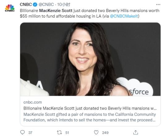 亞馬遜創始人杰夫?貝索斯(Jeff Bezos)前妻麥肯齊?斯科特(Mackenzie Scott)剛剛捐贈了位于加州洛杉磯富人區的兩棟豪宅。這兩棟住宅總價值約為 5500 萬美元,它們將被出售以幫助當地建設保障性住房籌集資金。