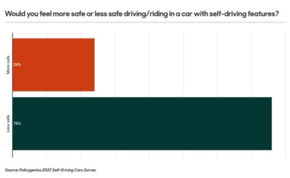保險平臺 Policygenius 進行的一項最新調查發現,四分之三的美國人覺得駕駛或乘坐具有自動駕駛功能的汽車不安全。同樣地,73% 的受訪者在得知其他人駕駛的是自動駕駛汽車時也感到不安全。Policygenius 此次調查針對的是大約 1500 名 18 歲以上的美國居民。