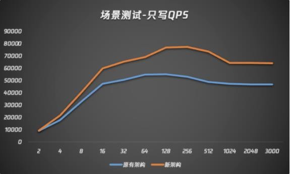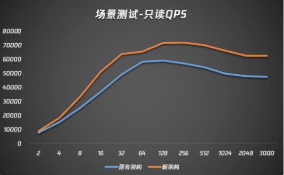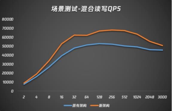 在只讀場景下,低線程數(shù)時搭載了新一代內(nèi)核的騰訊云數(shù)據(jù)庫 MySQL 的 QPS 增幅較大,趨近直線上升,在線程數(shù)達到 64 以后 QPS 上升平緩,總體性能始終高于上一代版本,且在線程數(shù)為 16 時,提升更是達到了近 25%。