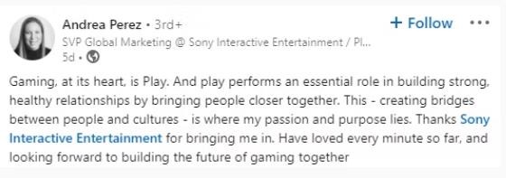 2022 年 9 月,前耐克全球副總裁兼喬丹女子部總經理安德烈-佩雷斯成為索尼互動娛樂(SIE)/PlayStation 的全球營銷高級副總裁。這一消息被多家媒體以及 SVP 的領英爆出,佩雷斯就她在耐克的工作和她在 SIE 的新角色進行了分享。