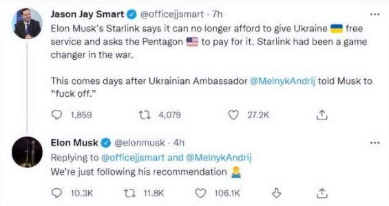 美國太空探索技術公司(SpaceX)創始人兼 CEO 埃隆·馬斯克 14 日發文稱, SpaceX 已無力繼續支付在烏克蘭運行“星鏈”項目的費用。有人聯想起本月初烏克蘭前駐德大使梅爾尼克曾和馬斯克在網上有一場罵戰,前者曾發文讓馬斯克“滾”。對于這條推文,馬斯克結合“星鏈”無法在烏克蘭運營一事,在評論區回復:我只是按他的建議去做了。
