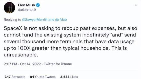 關于“星鏈”費用的問題,馬斯克表示 SpaceX 目前“向數千個數據使用量高達普通家庭 100 倍的終端發送信號”,為此耗資巨大,雖然 SpaceX 不打算向烏克蘭索要過去的服務費用,但馬斯克表示“不能無限期地為現有系統提供資金”。美國 CNN 新聞透露,馬斯克曾聯系美國國防部,要求后者為“星鏈”項目在烏克蘭的投資“買單”。