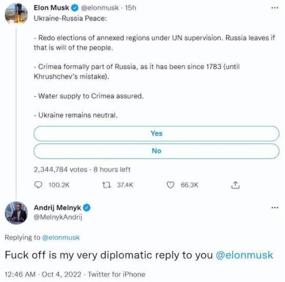 其中烏克蘭前駐德大使梅爾尼克在馬斯克的推文下,用“滾”的字眼厲聲斥責了馬斯克。