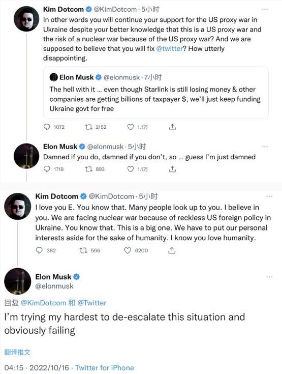 隨后,這名推特用戶接著說:“我喜歡你埃隆,你知道的。很多人都尊敬你。我相信你。由于美國在烏克蘭魯莽的外交政策,我們正面臨核戰(zhàn)爭。你知道的。這是個大問題。為了人類的利益,我們必須把個人利益放在一旁。我知道你熱愛人類。”就此,馬斯克回答說:“我嘗試盡最大的努力以緩解這種情況,但顯然我失敗了。”