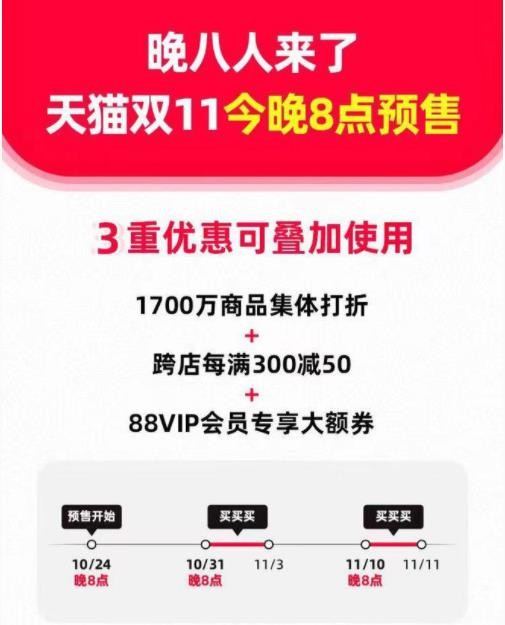 據(jù)介紹,今年雙 11,消費者可以將三重優(yōu)惠疊加使用:1700 萬商品集體打折、全場跨店每滿 300 減 50、88VIP 會員再領 820 元大額券。