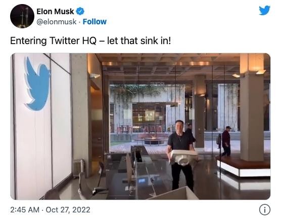 世界首富埃隆?馬斯克 (Elon Musk) 周三現身推特舊金山總部,他發布了一段自己抱著廚房水槽走進辦公室的視頻,并將自己的公開簡介改為“推特領袖”(Chief Twit)。