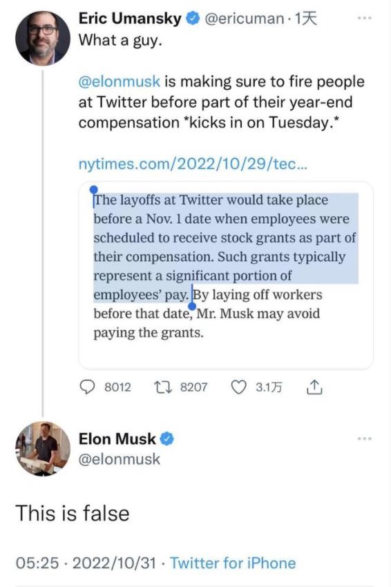 周日有推特用戶向馬斯克求證,是否決定要在本周二向一些推特員工發(fā)放部分年終獎前進行裁員。馬斯克回應稱:“這是假的。”