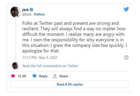 多西在推文中寫道:“推特過(guò)去和現(xiàn)在的員工都很堅(jiān)強(qiáng)。不管遇到多么困難的情況,他們總會(huì)找到辦法解決。我知道,很多人都對(duì)我感到不滿,我應(yīng)該對(duì)他們?nèi)缃竦奶幘池?fù)有責(zé)任,畢竟是我讓公司擴(kuò)張得太快了。我對(duì)此深表歉意。”