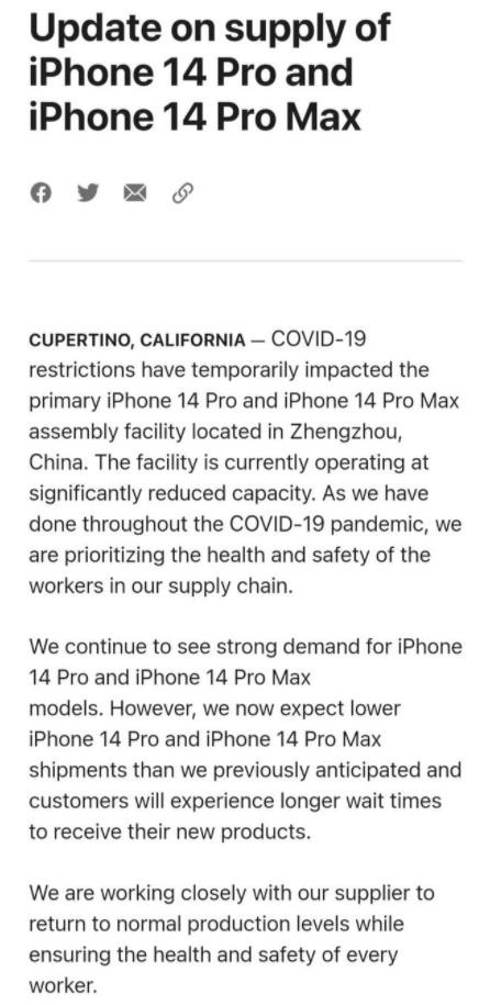 蘋果iPhone 14 Pro和iPhone 14 Pro Max目前供應(yīng)情況做出聲明 富士康鄭州工廠目前產(chǎn)能大幅降低 10:55:17