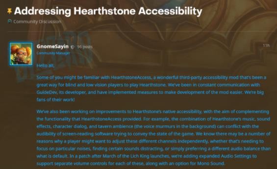 此前,有語音插件開發(fā)者 GuideDev 為《爐石傳說》的盲人玩家推出過輔助插件,通過語音輔助幫助他們進(jìn)行游戲。但因?yàn)閭€(gè)人力量優(yōu)先, GuideDev 表示無力繼續(xù)進(jìn)行插件更新。之后有盲人玩家開始尋找解決方案,并向暴雪請(qǐng)?jiān)笌椭麄兝^續(xù)游戲。