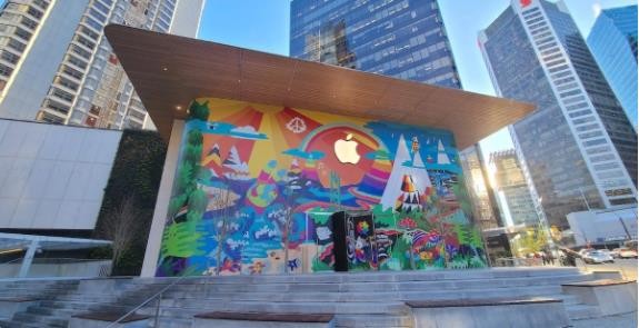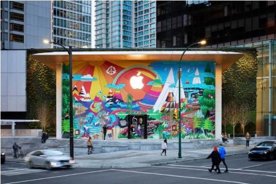 新的 Apple 太平洋中心店位于西喬治亞街和 Howe 街的對角線上,面向溫哥華藝術館。為了慶祝該零售店的盛大開業,玻璃外墻被加拿大著名設計師 Mo Bofill 與 Musqueam 藝術家 Debra Sparrow 合作創作的彩色藝術作品所包裹。