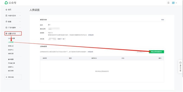 2.在左側菜單最下面找到設置與開發(fā)里的人員設置,這樣我們就能看到右側的綁定運營者微信號了。