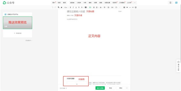 3.進(jìn)入到圖文消息后,我們就看到了編輯文章的地方,根據(jù)需求寫(xiě)好文章標(biāo)題內(nèi)容等信息,然后上傳文章封面圖片。如果只是簡(jiǎn)單的文字信息可以直接在此處編輯,如果想讓文章更豐富一些,有很多樣式效果,那么就去外面專門(mén)的編輯器網(wǎng)站編寫(xiě)文章,里面有很多樣式效果,邊框,圖片等可以選擇,讓你的文章看著更豐富更好看。