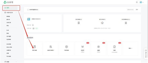 2.在左側(cè)首頁(yè)標(biāo)簽里找到新的創(chuàng)作--圖文消息,然后點(diǎn)擊進(jìn)入。