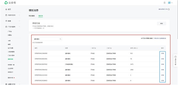 4.比如我們需要退款通知,在搜索框中輸入退款通知,就可以搜索出退款的模板消息,點擊后面詳情進(jìn)入查看哪個是自己需要的。