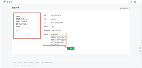 5.點詳情進(jìn)入后我們就可以看到模板的實例和詳細(xì)內(nèi)容,點擊添加就會到模板消息列表里。