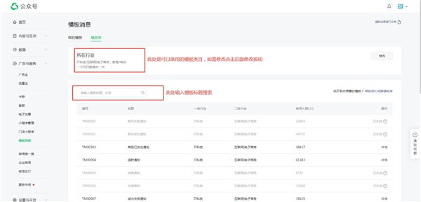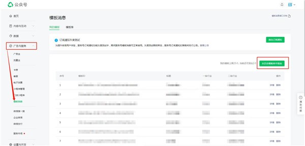 2.在左側(cè)菜單中找到廣告與服務(wù)--模板消息,點擊進(jìn)入后就可以看到右側(cè)的添加消息按鈕了。此處要注意,不同的類目可以添加的模板消息也不同,首先要給公眾號添加上相應(yīng)的類目。