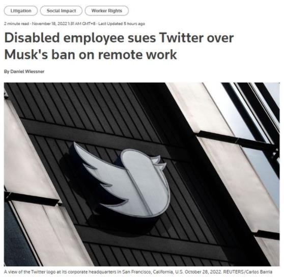 據(jù)路透社,一項(xiàng)新的訴訟聲稱(chēng),Twitter 公司老板馬斯克要求員工停止遠(yuǎn)程工作,并在“高強(qiáng)度下長(zhǎng)時(shí)間工作”,是對(duì)殘疾工人的歧視。