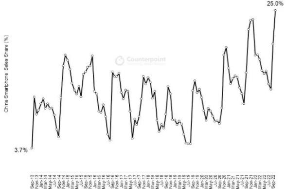 研究機構 Counterpoint 報告稱,2022 年 10 月,蘋果公司在中國的月度市場份額達 25% 為歷史最高水平,且連續兩個月成為中國第一大手機品牌廠商。