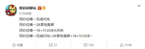 據數碼博主 @數碼閑聊站 最新發布的信息顯示,即將亮相的一款新機將擁有同價位唯一無線閃充、唯一 2K 柔性直屏、唯一 16+512GB 大內存,集如此三項頂級配置于一身,可見該機堆料的豪橫程度。