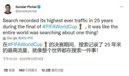 FIFA 卡塔爾世界杯決賽期間刷新了谷歌成立 25 年以來的最高流量紀錄。谷歌首席執行官桑達爾?皮查伊(Sundar Pichai)在最新推文中宣布流量打破公司成立 25年以來紀錄。