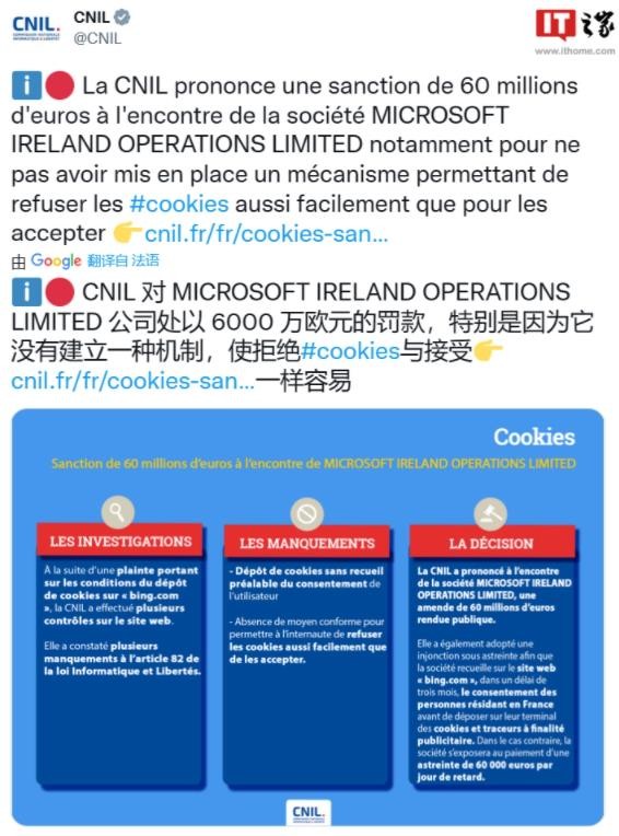 法國國家數據保護委員會 (CNIL) 周四表示,已對微軟愛爾蘭公司處以 6000 萬歐元(約 4.45 億元人民幣)罰款,因為該公司沒有建立一種機制,讓人們像接受 Cookie 一樣容易地拒絕 Cookie。