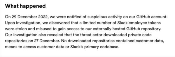 2022 年 12 月 29 日,我們被告知我們的 GitHub 賬戶上有可疑活動(dòng)。經(jīng)調(diào)查,我們發(fā)現(xiàn)數(shù)量有限的 Slack 員工令牌被盜,并被濫用于訪問我們外部托管的 GitHub 倉庫。我們的調(diào)查還顯示,黑客在 12 月 27 日下載了私有代碼庫。下載的倉庫沒有包含客戶數(shù)據(jù)、訪問客戶數(shù)據(jù)的手段或 Slack 的主要代碼庫。
