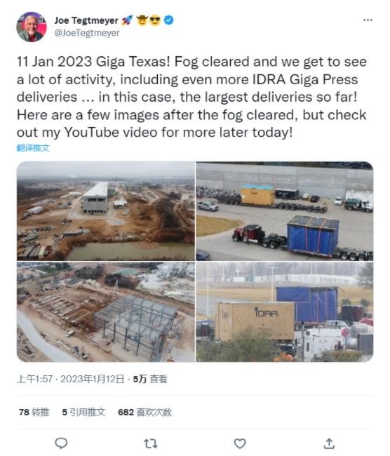 本周早些時候,無人機觀察員 @Joe Tegtmeyer 發現由意德拉集團(IDRA)供應的 9000 噸壓鑄機開始在特斯拉得州工廠壓鑄車間開始安裝。