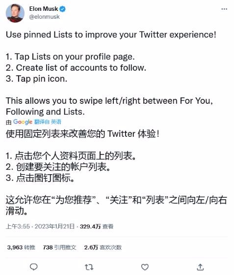 馬斯克在推文中預告了固定列表功能,并介紹了啟用該功能所需的 3 個步驟。事實上這項功能早在 2019 年就已經上線,只是用戶使用頻率并不高,最終 Twitter 回歸了正常的時間軸。