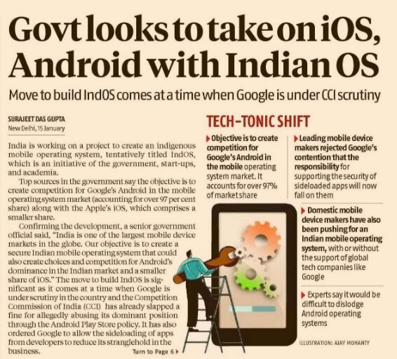 在印度移動操作系統中,蘋果的 iOS 和谷歌的 Android 兩家幾乎占據了所有份額。印度為了應對這樣的危機,決定開發和推廣名為 IndOS 的系統。