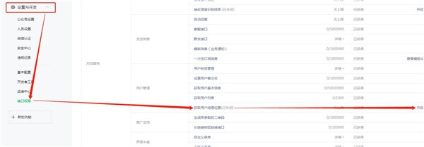2.進(jìn)入到公眾號(hào)后臺(tái),找到左側(cè)菜單設(shè)置與開發(fā)里的接口權(quán)限,然后右邊就可以看到用戶管理中的獲取用戶地理位置是已關(guān)閉的狀態(tài),點(diǎn)擊后方開啟。