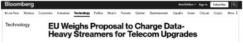 該提案是歐盟執行機構從“公平分享”(fair-share)的愿景出發提出的,該愿景要求提供流媒體視頻和其他數據密集型服務的大型科技企業幫助支付它們產生的流量。