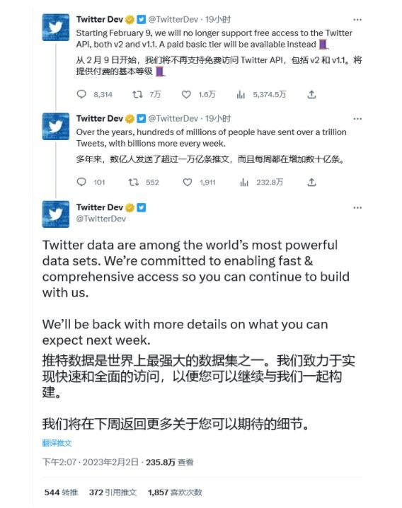 Twitter 官方開發(fā)者賬號(hào)在推文中表示:“我們宣布自 2 月 9 日開始,不再支持免費(fèi)訪問 v1.1 和 v2 版本的 Twitter API,后續(xù)我們將推出付費(fèi)的基礎(chǔ)套餐”。