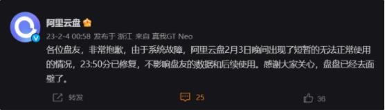 各位盤友,非常抱歉,由于系統故障,阿里云盤 2 月 3 日晚間出現了短暫的無法正常使用的情況,23:50 分已修復,不影響盤友的數據和后續使用。感謝大家關心,盤盤已經去面壁了。