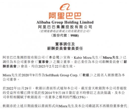 公告稱,米斯拉在 2020 年 9 月作為軟銀的提名人被推選為公司董事。2022 年 11 月 29 日,軟銀以書面形式通知阿里,截至當天,軟銀對阿里普通股的受益所有權已降至低于按 2014 年 9 月 18 日簽訂并不時修訂之表決協議,及本公司章程相關賦予軟銀提名一名董事之權利的門檻(15%)。軟銀也于上述日期前后以書面形式向米斯拉及阿里確認其不再維持董事會代表,米斯拉也確認終止在董事會代表軟銀的身份。