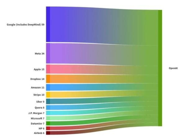 LeadGenius 和 Punks & Pinstripes 的數據顯示,該公司兩百多名員工中有許多來自 Alphabet 公司。數據顯示,OpenAI 目前雇傭了約 59 名前谷歌員工和約 34 名前 Meta 員工。該公司還雇傭了幾名前蘋果和亞馬遜員工。