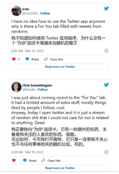 大量推特用戶(hù)抱怨 為你推薦中突然涌入大量未關(guān)注賬號(hào)的推文內(nèi)容 10:46:37