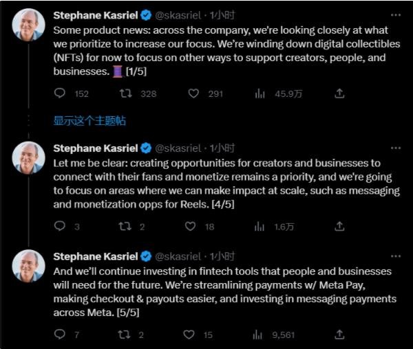 當地時間周一,這家社交媒體公司的金融科技主管 Stephane Kasriel 發推表示:“我們目前正在逐步減少數字藏品 (NFT),專注于其他方式來支持創作者、個人和企業。”