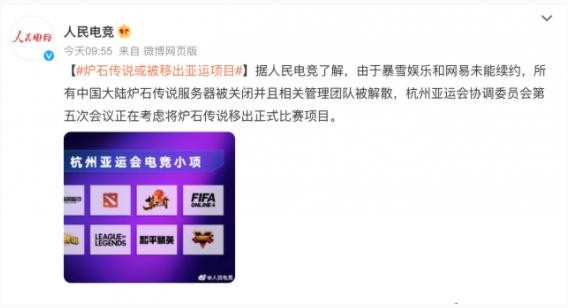 據(jù)人民電競官微消息,由于暴雪娛樂和網(wǎng)易未能續(xù)約,所有中國大陸爐石傳說服務(wù)器被關(guān)閉并且相關(guān)管理團(tuán)隊(duì)被解散,杭州亞運(yùn)會(huì)協(xié)調(diào)委員會(huì)第五次會(huì)議正在考慮將爐石傳說移出正式比賽項(xiàng)目。