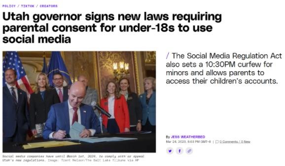 據外媒 The Verge 報道,美國猶他州頒布了有爭議的限制措施,要求 18 歲以下未成年人獲得監護人的同意才能使用社交媒體平臺,這是美國第一個出臺此類措施的州。