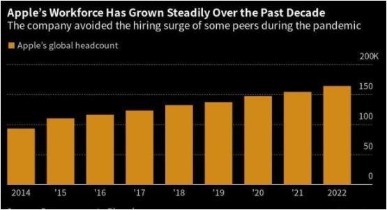 截至去年 9 月,蘋果公司共有 16.4 萬名員工。在疫情期間,該公司沒有像其他大型科技公司那樣迅速擴大員工規模,也因此避免了大規模裁員。