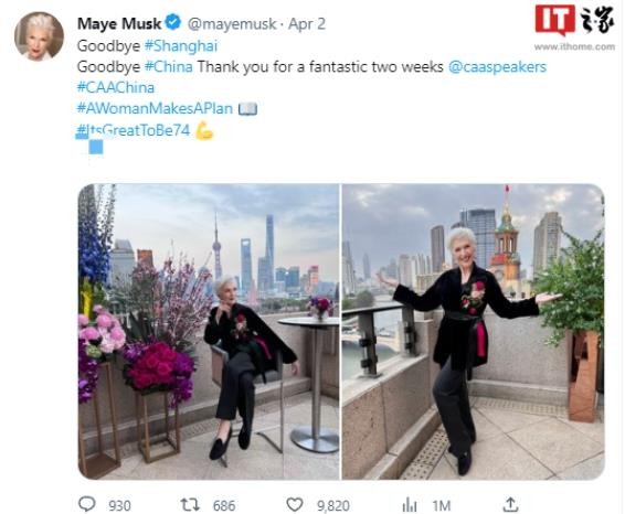 美國億萬富翁、特斯拉創始人、推特 CEO 埃隆?馬斯克的母親梅耶?馬斯克近日結束了她的中國之行,她在社交媒體上分享了她在上海、湖州、廣州、蘇州、廈門、成都、武漢等地的旅游見聞,稱贊中國的美景和友好的人們,感謝中國給她帶來了兩周的美好時光。