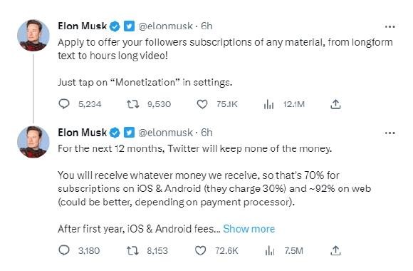 馬斯克補(bǔ)充道,在服務(wù)上線最初的 12 個(gè)月中,內(nèi)容發(fā)布者將獲得除去移動(dòng)平臺(tái)費(fèi)用(iOS 或安卓商店抽成 30%)之外的全部訂閱收入,推特不會(huì)從中截留任何一分錢。網(wǎng)頁版則能讓創(chuàng)作者拿到 92% 的收入,所以馬斯克也更推薦這一選項(xiàng)。